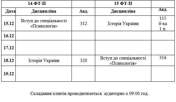 Розклад екзаменаційної сесії для студентів першого курсу ФТ