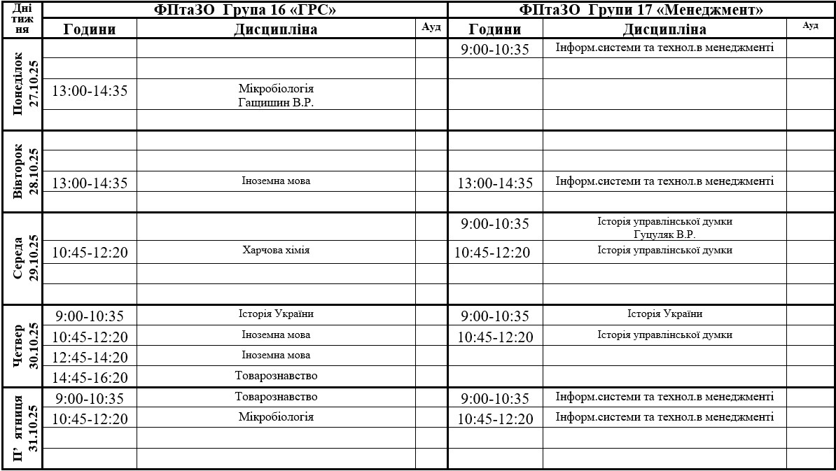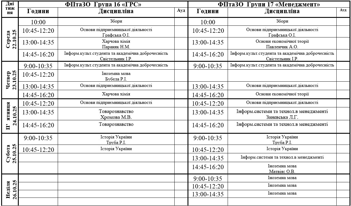 Розклад занять 1-го курсу ФПЗО (групи 16ПЗО, 17ПЗО)